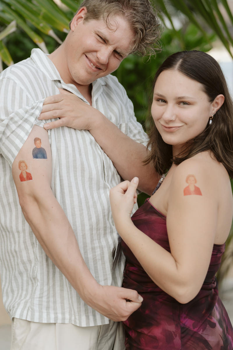 And while the celebration was simple, there were plenty of thoughtful and fun details to be found. While the handfasting was a lovely ceremony addition, they got me with the custom tattoos. Yes, every single guest was wearing custom temporary tats made from goofy childhood pics of the bride and groom. The silliness of the idea was matched only by the guests’ creativity in placement — I loved it.