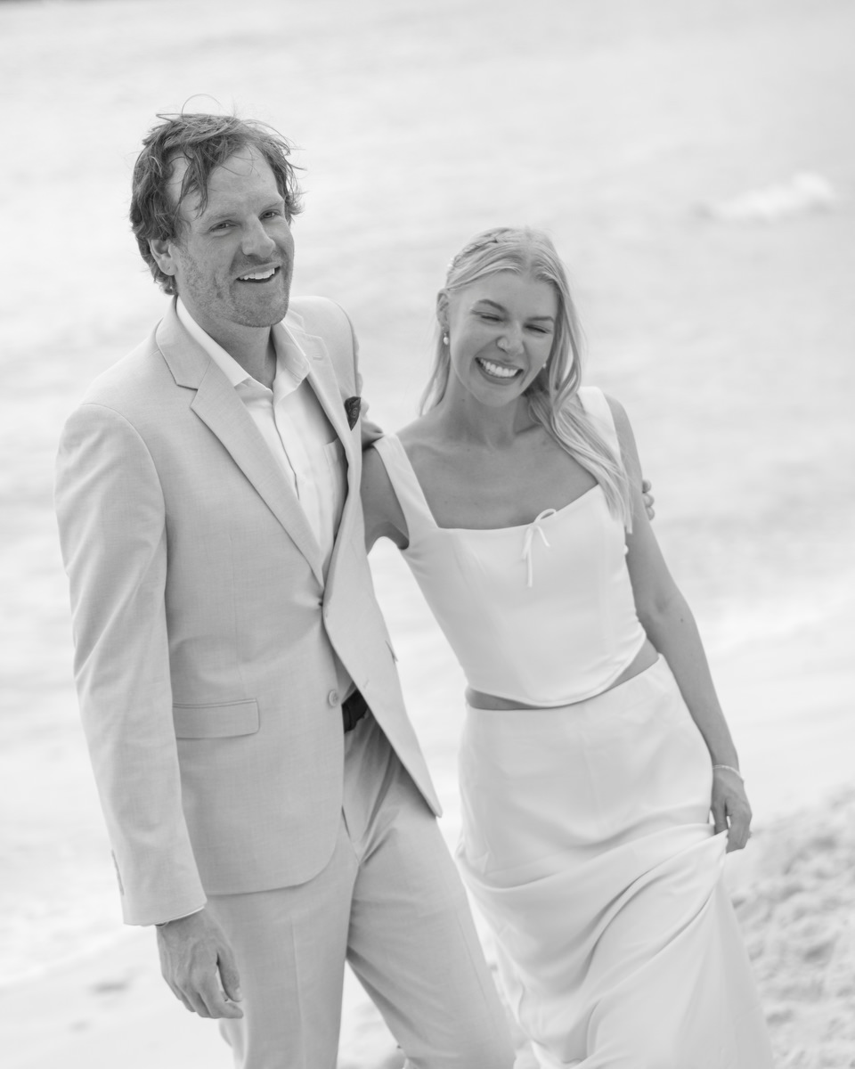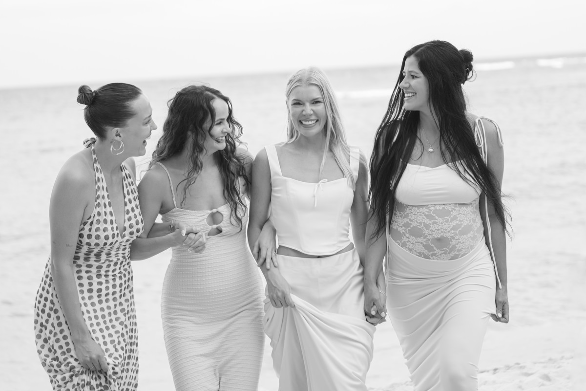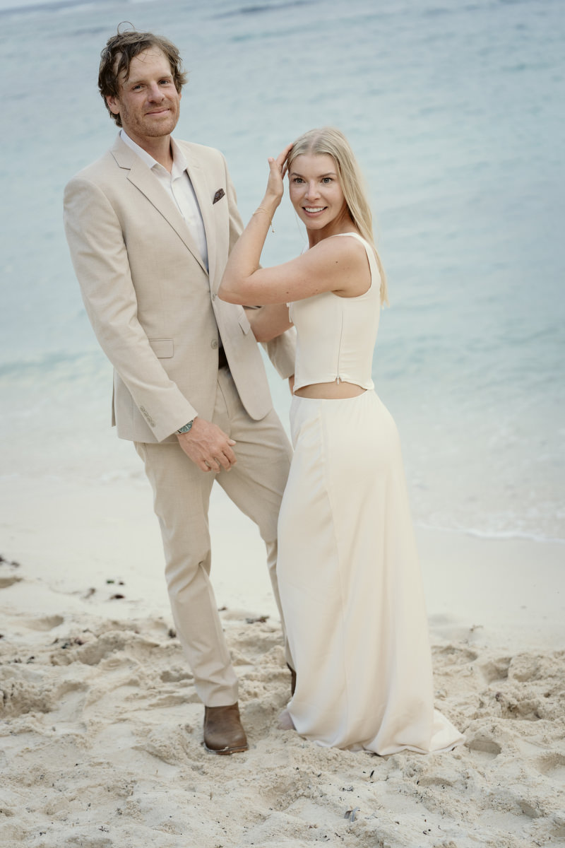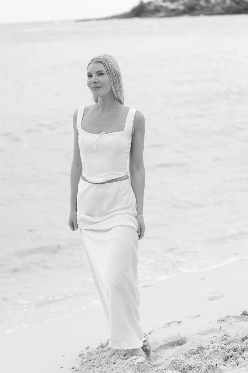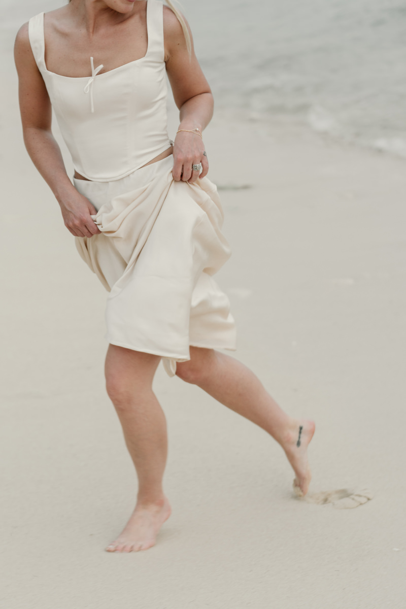 Another detail that won my heart was the bride’s take on the 2026 corset bridal trend. She found the perfect way to style it for a casual, barefoot beach wedding, choosing separates: a square-necked cream corset top with a simple bow and a matching maxi skirt. Quiet bridal chic, and a beach-appropriate take on a classic silhouette, perfect for Half Moon Bay, Akumal.
