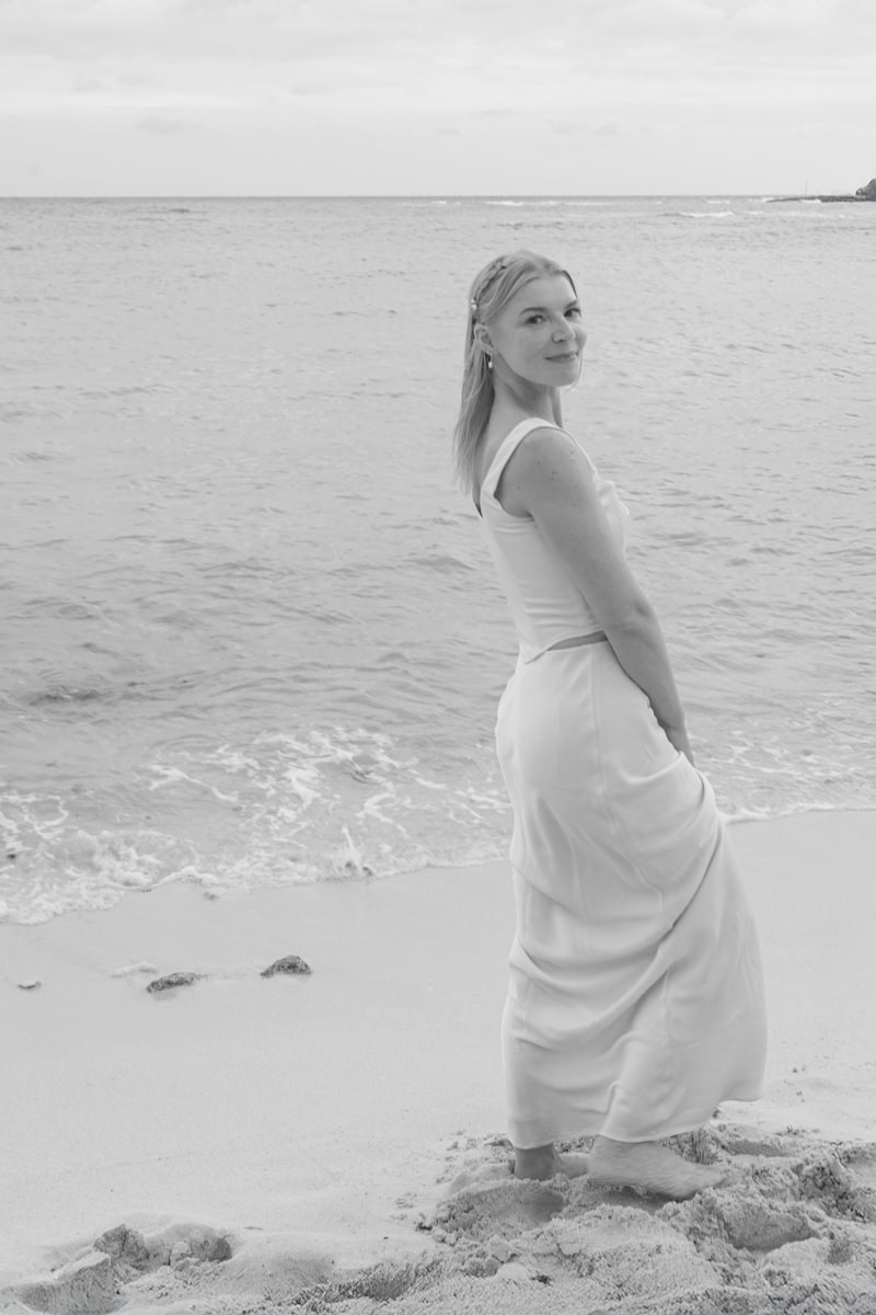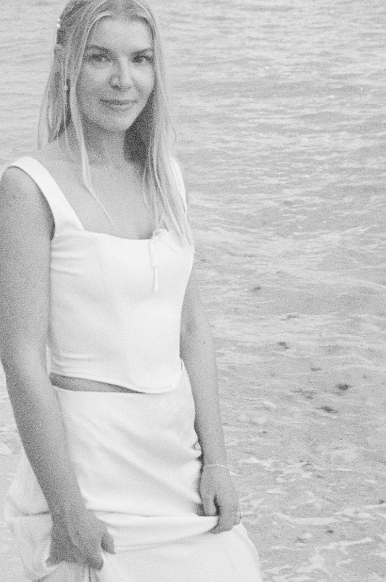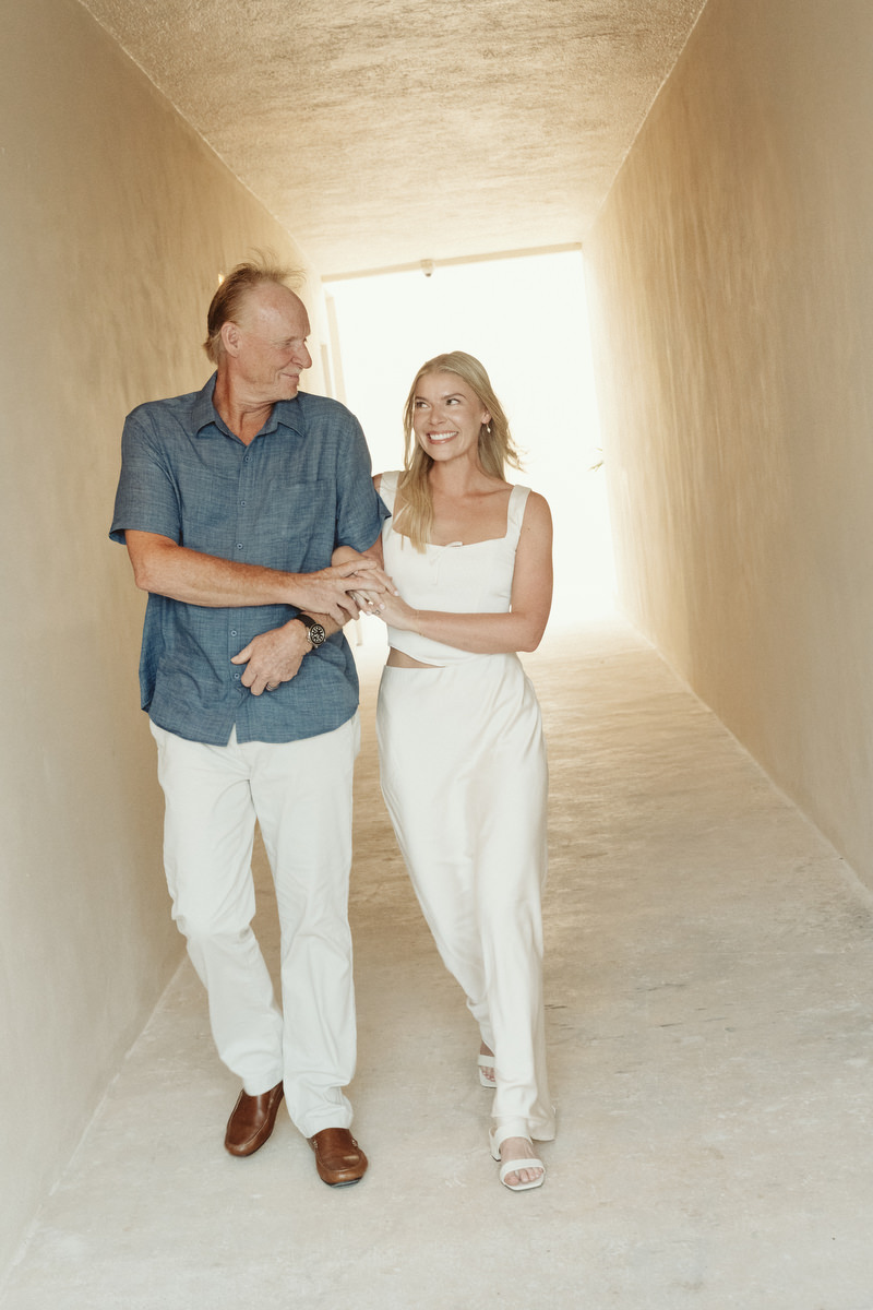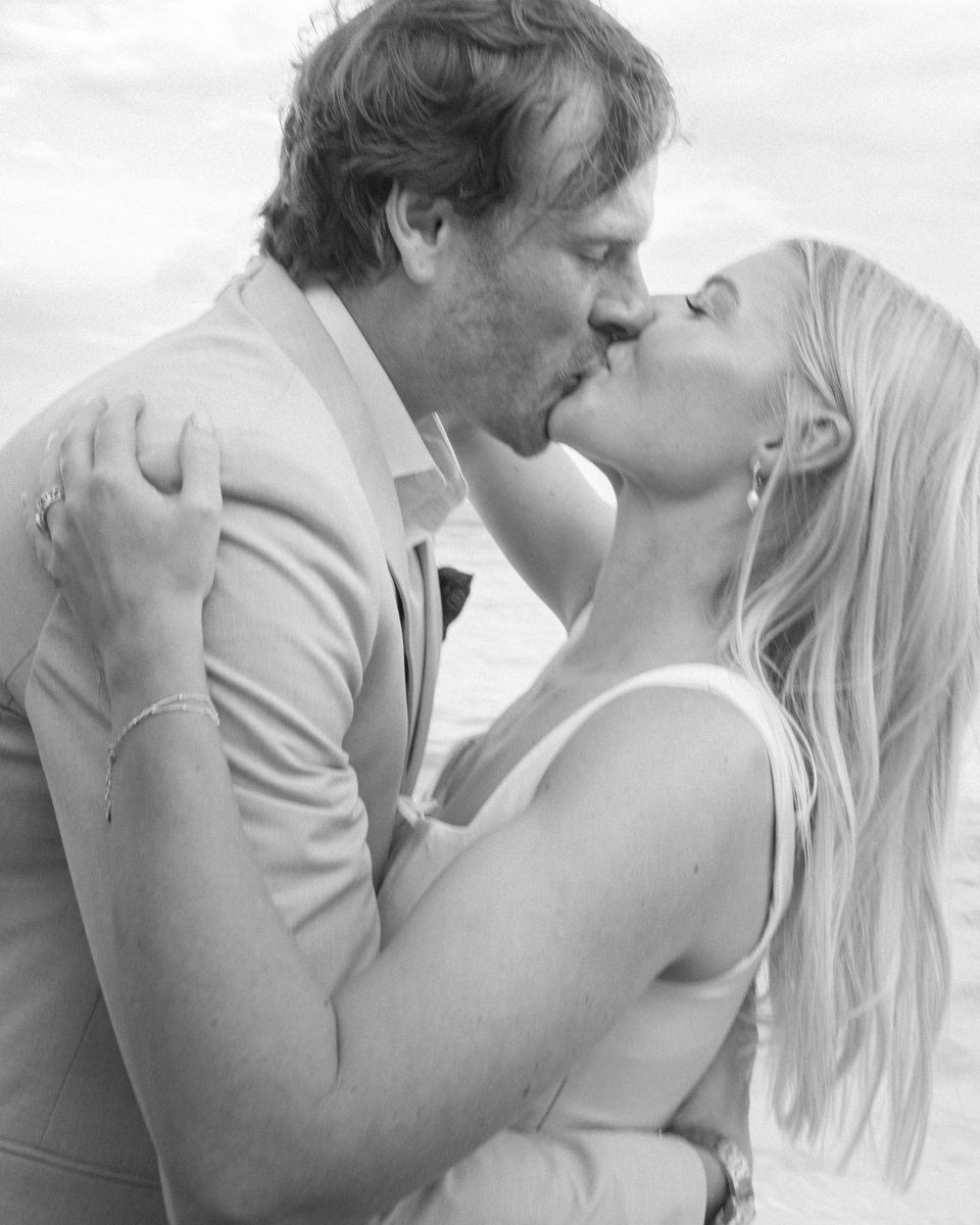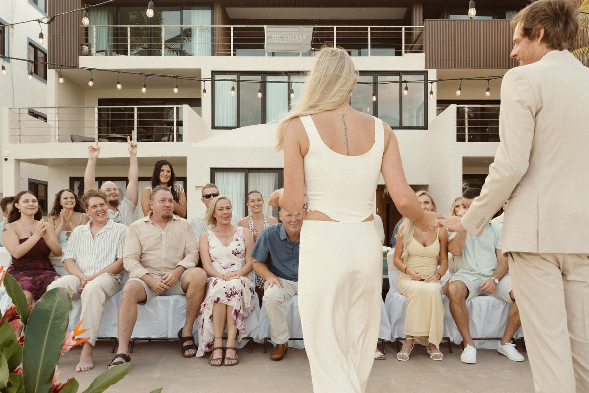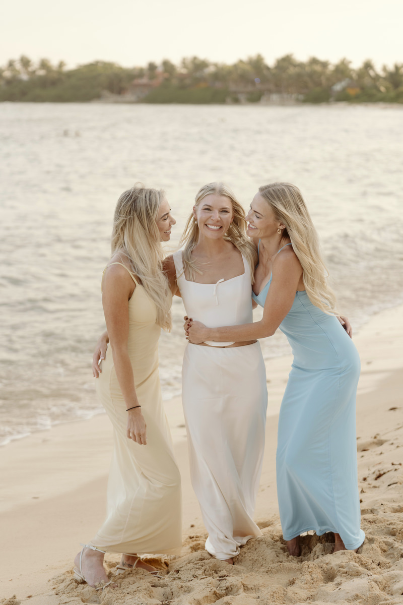 Another detail that won my heart was the bride’s take on the 2026 corset bridal trend. She found the perfect way to style it for a casual, barefoot beach wedding, choosing separates: a square-necked cream corset top with a simple bow and a matching maxi skirt. Quiet bridal chic, and a beach-appropriate take on a classic silhouette, perfect for Half Moon Bay, Akumal.
