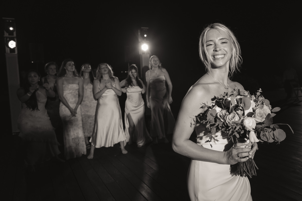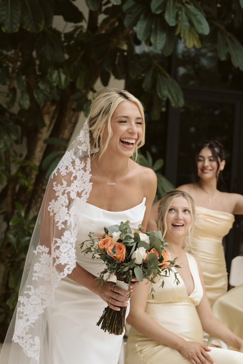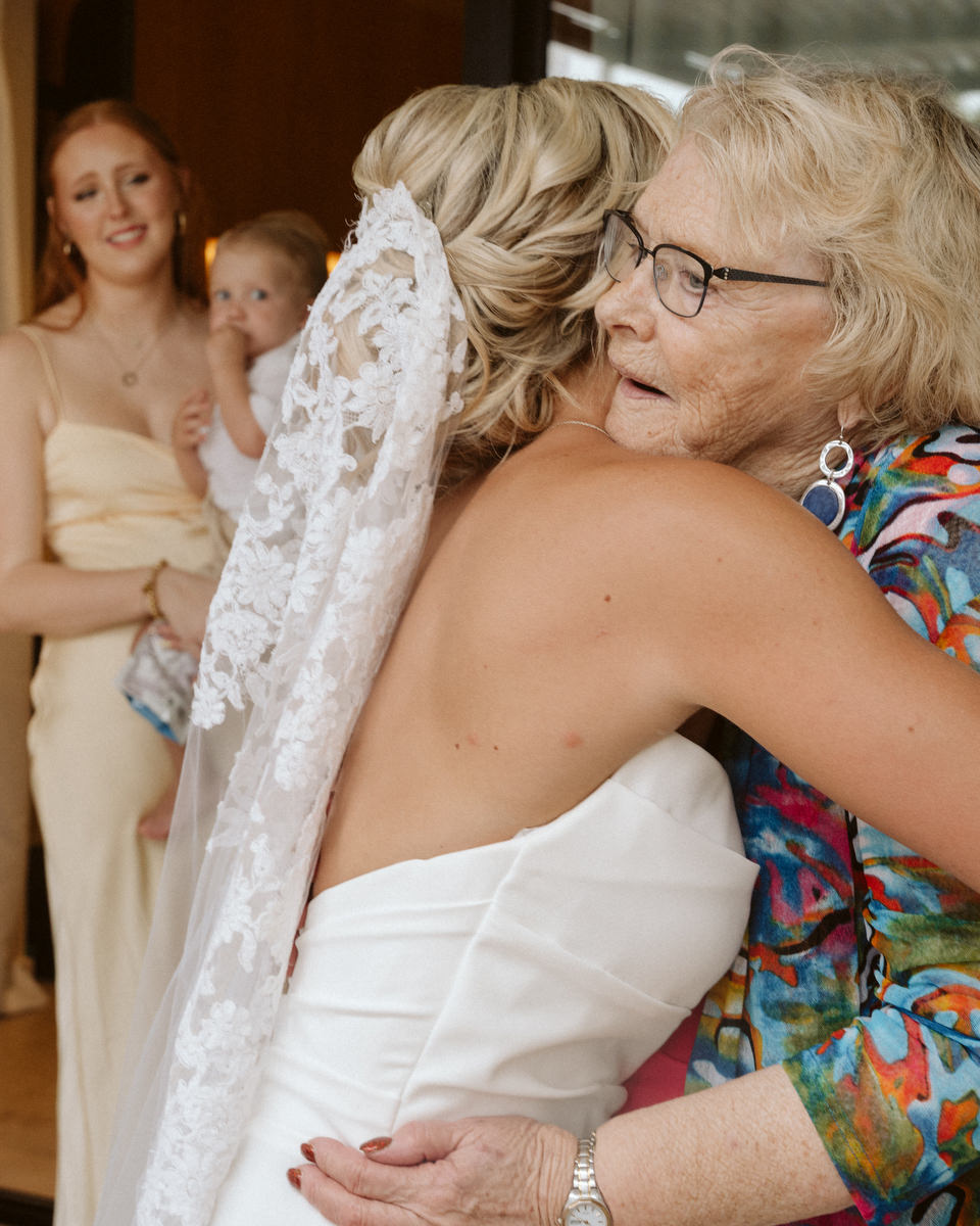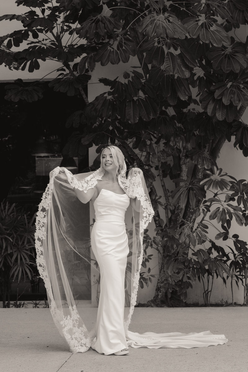The most striking wedding detail wasn’t on the table plan or the florals, but the bride’s veil. It had belonged to Alex’s grandmother, passed down through the women of her family, cathedral-length, heavy lace edging and a stunning addition to her contemporary draped corseted mermaid wedding dress.